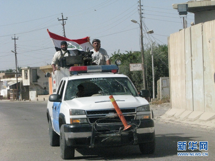 7月27日,在伊拉克萨拉赫丁省杜卢伊耶镇,伊拉克部族武装搭载警车巡逻。在过去一个多月,当地部族武装联合伊拉克军队和警察等安全部队,共同抵抗“伊斯兰国”极端组织分子的进攻。杜卢伊耶镇位于首都巴格达以北大约90公里。(新华网 夏兰· 朱布里 摄)
