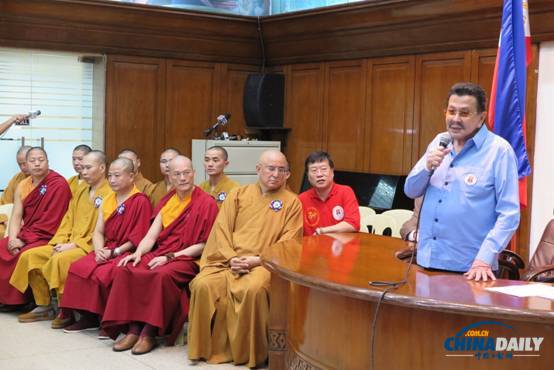 马尼拉市长埃斯特拉达(右一)称将尽力办好此追悼大会与超度法会。(中国日报记者张燕 摄)