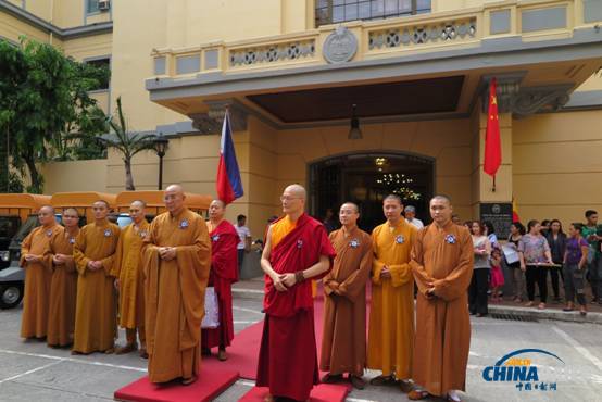 香港极乐寺僧人在马尼拉市政府大楼前。(中国日报记者张燕 摄)