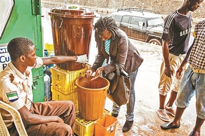 当地时间8月6日,塞拉利昂弗里敦,进入大楼前,民众需先洗手图片/IC