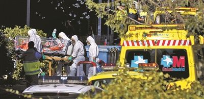 当地时间8月7日,西班牙马德里,多名医护人员身着防护服,抬着感染埃博拉病毒的西班牙天主教神父Miguel Pajares进入卡洛斯三世医院图片/IC
