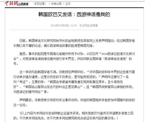 通过检索国内网站,记者看到了中新网山西新闻7月28日所转载的湖北的长江网生活频道消息《韩国欧巴又发话:西游神话是我的》,文章称“日前,韩国神话文化研究院秘书长的金姓教授在其官网上发表声明指出:经过韩国学者长期以来不懈的论证,确认西游神话故事的起源是韩国无疑。”这篇文章还提出了所谓顺道寺藏有真经和智异山原名花果山的证据。但在9日记者发稿时长江网生活频道上已经没有这条新闻。