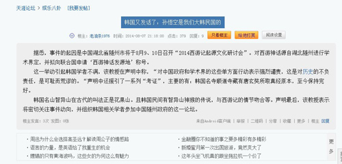 通过进一步搜索,记者在天涯论坛上找到了一篇2011年8月5日的网帖,该网帖文章首先介绍了一款网络,称该游戏网站论坛发生争吵,争论孙悟空起源于哪里。文章说论坛上一韩国人举出了韩国首尔大学教授金浩熙所写的文章,称“据《三国遗事.神咒篇》记载:‘檀君隐居阿斯达,有一山猴相伴,教其习人语,渐通人性,张口能言……’;傲来国发音和高丽相似等等。”