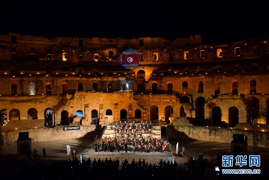 8月9日,在突尼斯中部的埃尔•杰姆古罗马斗兽场,中国中央歌剧院的艺术家们演奏交响乐。新华网记者 张远摄