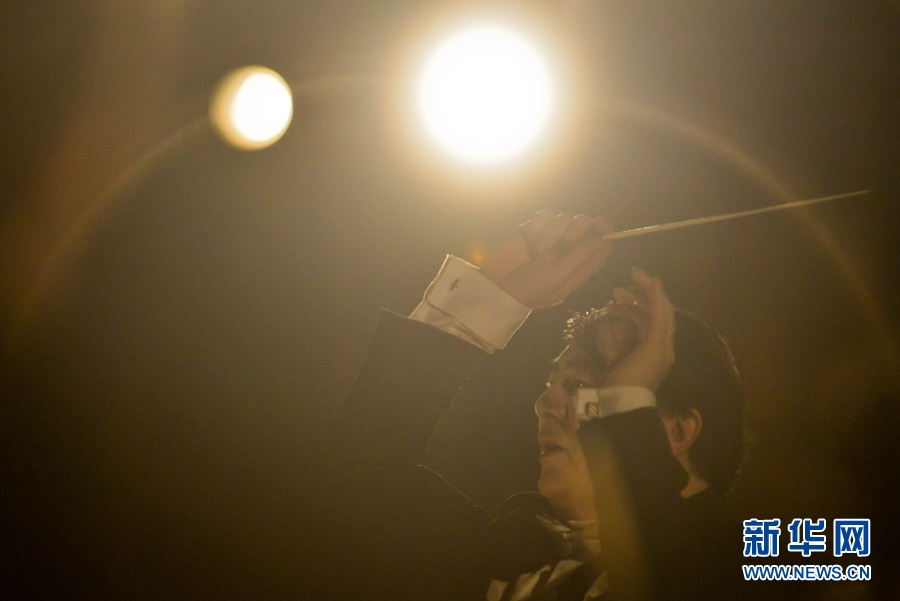 8月9日,在突尼斯中部的埃尔•杰姆古罗马斗兽场,中央歌剧院院长、著名指挥家俞峰正在指挥交响乐团。新华网记者 张远摄