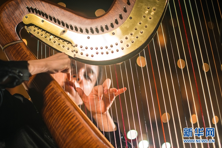 8月9日,在突尼斯中部的埃尔•杰姆古罗马斗兽场,一名乐手弹奏竖琴。新华网记者 许杨摄