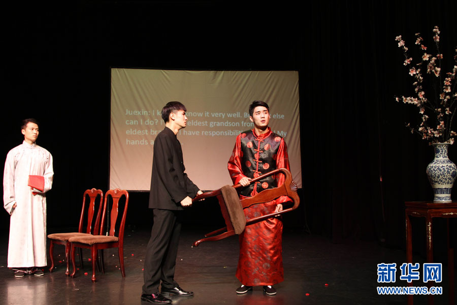 近日, 中央戏剧学院学生在英国苏格兰首府爱丁堡一家音乐中心参加爱丁堡边缘艺术节表演话剧《家》。爱丁堡边缘艺术节是世界上大型艺术节之一,8月1日至25日举行,市中心的许多大街小巷、酒吧餐馆和剧院都成为舞台,来自多个国家的表演者为观众带来欢乐。 新华网记者郭春菊摄