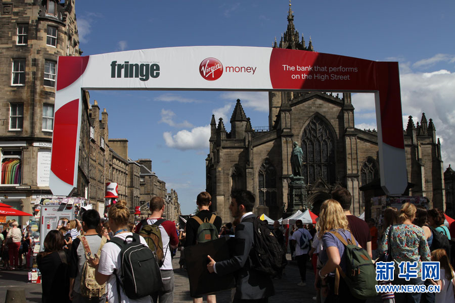 近日, 游客在英国苏格兰首府爱丁堡皇家一英里大街上观看爱丁堡边缘艺术节的演出宣传活动。爱丁堡边缘艺术节是世界上大型艺术节之一,8月1日至25日举行,市中心的许多大街小巷、酒吧餐馆和剧院都成为舞台,来自多个国家的表演者为观众带来欢乐。新华网记者郭春菊摄