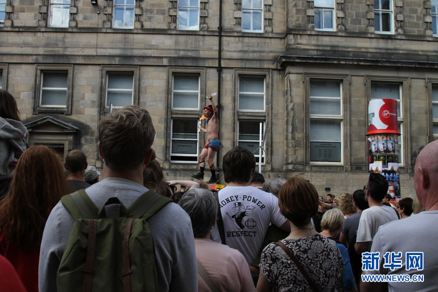 近日, 游客在英国苏格兰首府爱丁堡皇家一英里大街上观看爱丁堡边缘艺术节的杂技表演。爱丁堡边缘艺术节是世界上大型艺术节之一,8月1日至25日举行,市中心的许多大街小巷、酒吧餐馆和剧院都成为舞台,来自多个国家的表演者为观众带来欢乐。新华网记者郭春菊摄