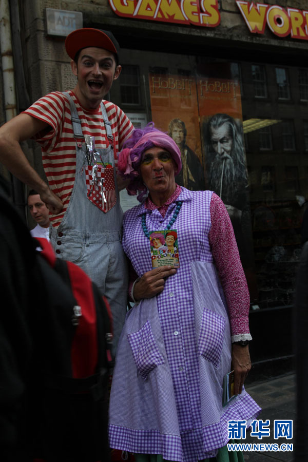 近日, 两位男士在英国苏格兰首府爱丁堡皇家一英里大街上发放爱丁堡边缘艺术节的演出宣传单。爱丁堡边缘艺术节是世界上大型艺术节之一,8月1日至25日举行,市中心的许多大街小巷、酒吧餐馆和剧院都成为舞台,来自多个国家的表演者为观众带来欢乐。新华网记者郭春菊摄