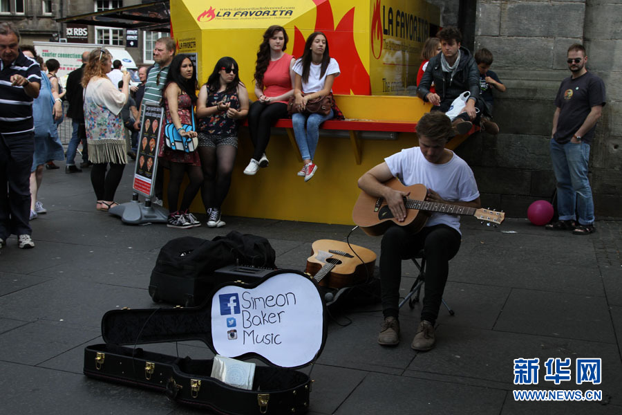 近日, 一名年轻人在英国苏格兰首府爱丁堡皇家一英里大街上参加爱丁堡边缘艺术节表演吉他弹奏。爱丁堡边缘艺术节是世界上大型艺术节之一,8月1日至25日举行,市中心的许多大街小巷、酒吧餐馆和剧院都成为舞台,来自多个国家的表演者为观众带来欢乐。新华网记者郭春菊摄
