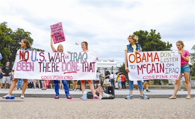 8月11日,在美国首都华盛顿白宫前,一些民众举着标语,高喊口号,抗议美国总统奥巴马授权空袭伊拉克的行为摄影/新华社记者 鲍丹丹