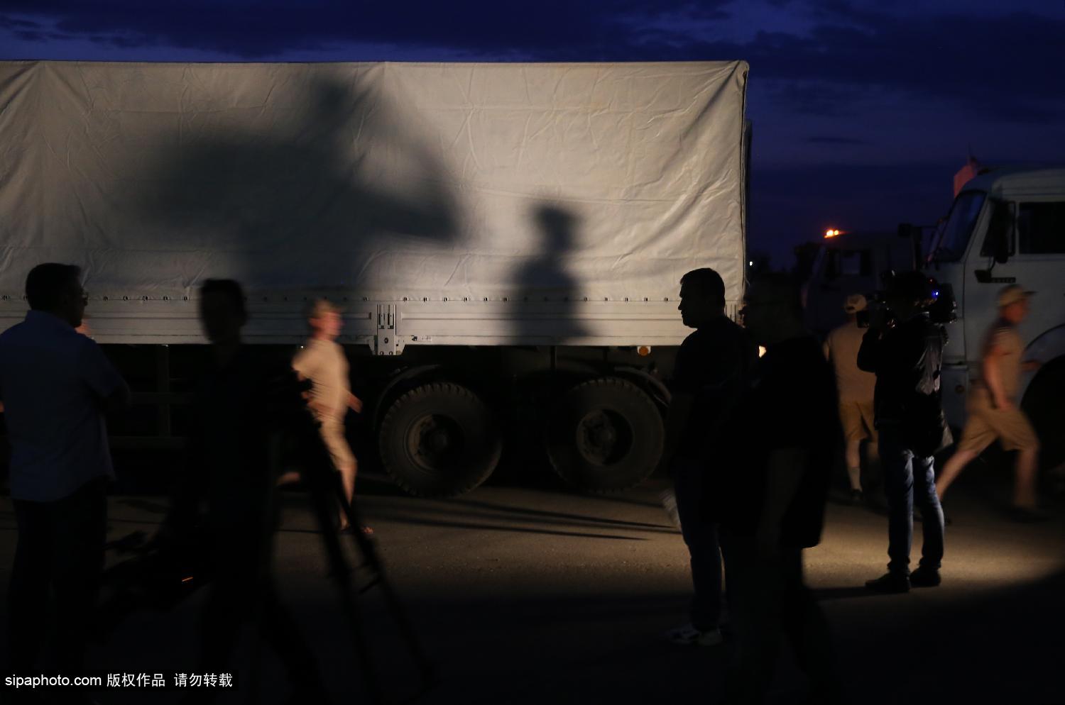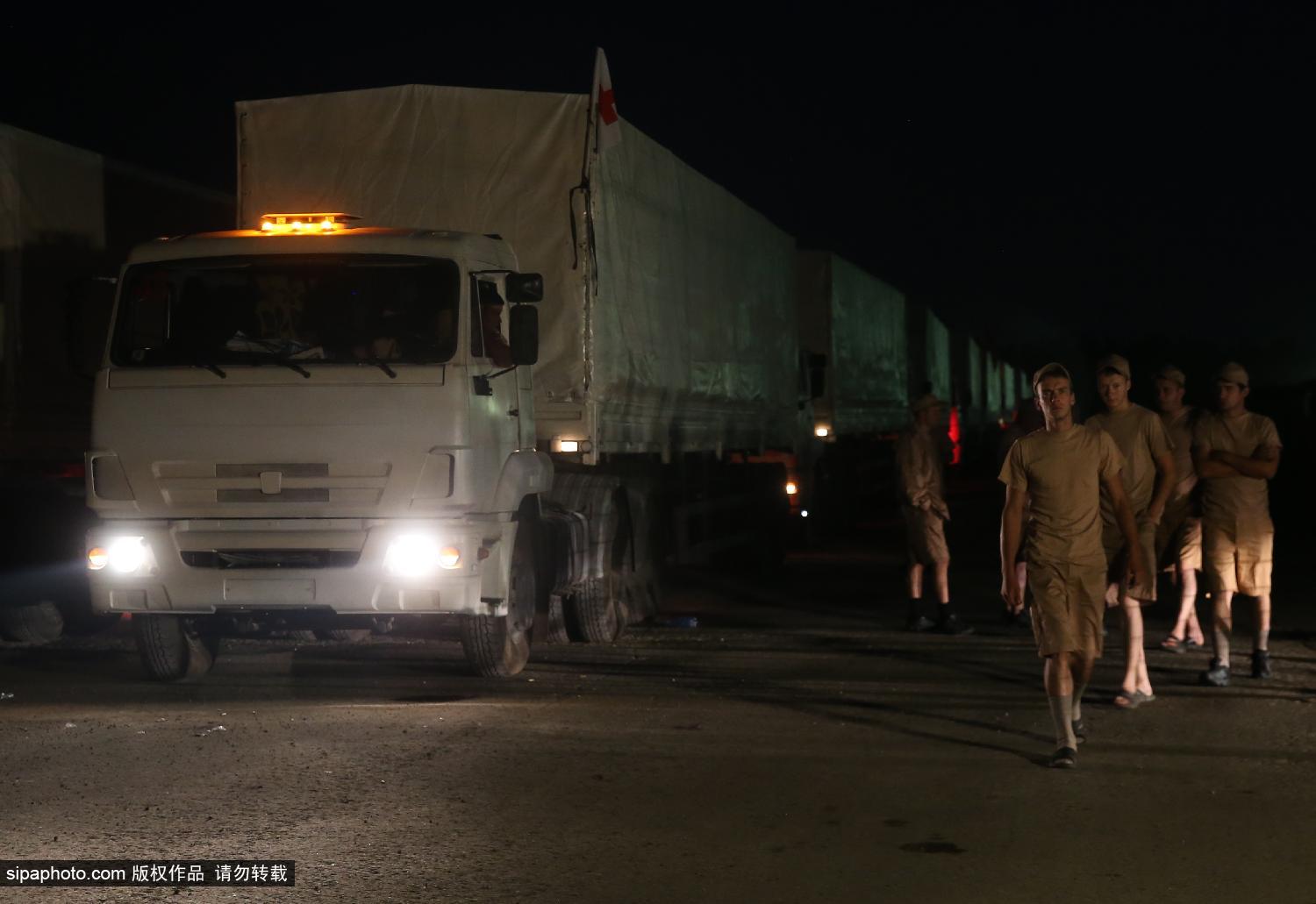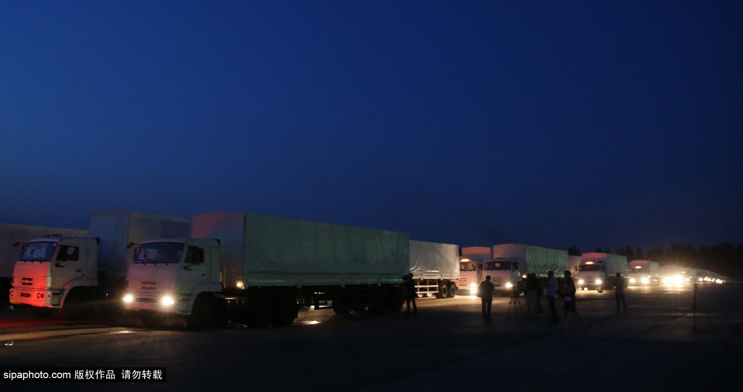 当地时间2014年8月12日夜间,俄罗斯,卡车自阿拉比诺出发前往乌克兰,将为乌克兰运去人道主义援助物资。