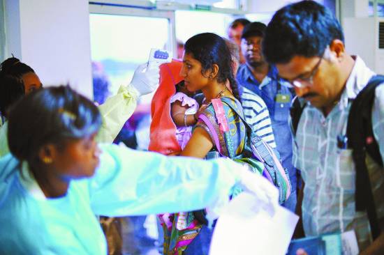 8月12日,塞拉利昂弗里敦塞拉利昂国际机场,医护人员在为乘客测体温。塞拉利昂当日宣布,将寻求一批有争议的药物,用以对抗埃博拉病毒。 CFP供图