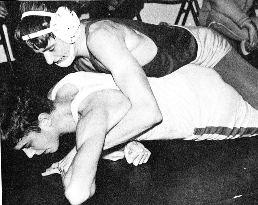 头戴护具的男孩为比赛中的威廉姆斯 在当年的摔跤比赛中,威廉姆斯所向披靡,轻松将对手撂翻在地。