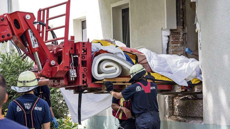 当地时间8月13日清晨7时30分,柏林市消防队的队员抵达一处多户公寓外。此前,他们接到求救电话,一名42岁的女子急需就医,但她肥胖的身躯根本无法通过大门。因此,消防队员决定将她的卧室窗户拆除,并以此为基础将周围的墙壁凿开。