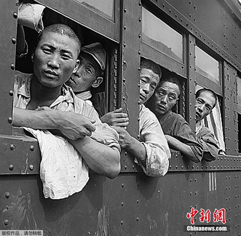 1945年9月,在日本广岛,拥挤的火车载着日本士兵回到她们的家园。