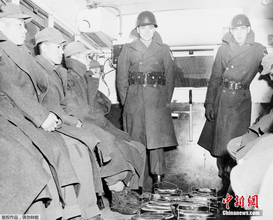 日本战俘在囚车里被运动到审讯地点。