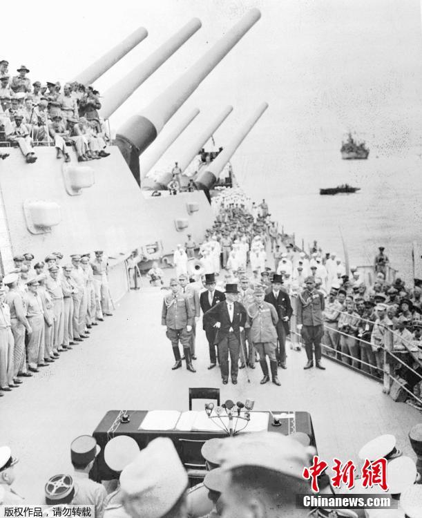 1945年9月2日上午9时,在停泊于东京湾的美国战列舰密苏里号上举行日本投降的签降仪式。