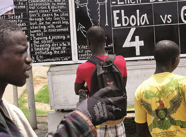 8月2日,利比亚首都蒙罗维亚,人们聚集在公告板前查看埃博拉病毒蔓延的情况。埃博拉病毒在西非爆发后,已造成七百多人死亡,病情蔓延的速度几近失控。摄影/Abbas Dulleh