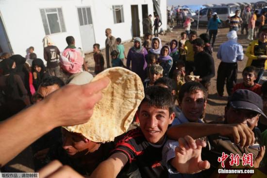 当地时间2014年8月12日,从伊拉克逃亡叙利亚Derike的雅兹迪派难民聚集在难民营中,领取食品和衣物等救济品。此前,美国、英国和伊拉克曾派货机向该地区投放给养,包括数十吨的食物、饮水以及帐篷等物资。