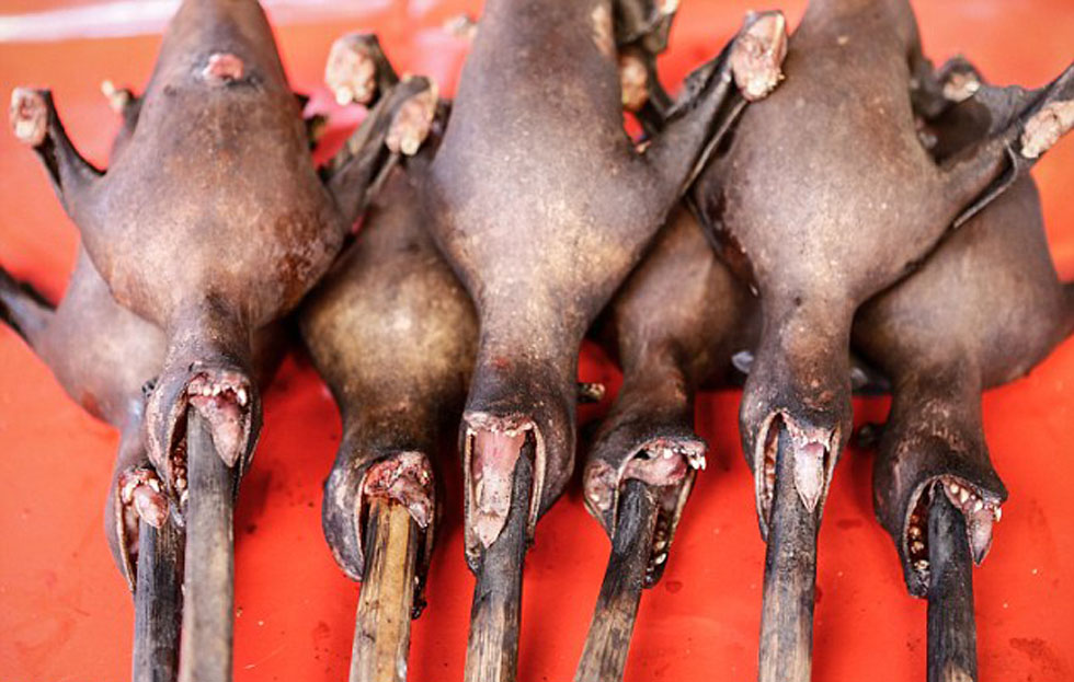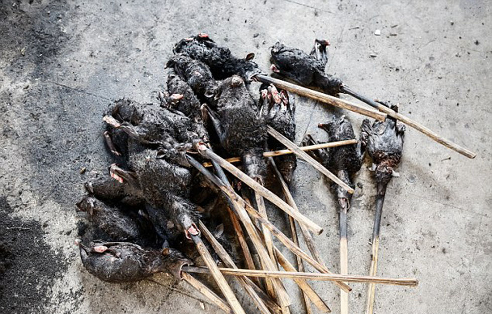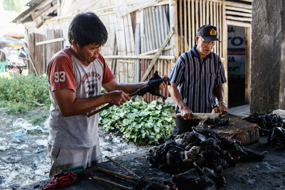 男子正在把蝙蝠穿起来,打算接下来作烧烤用。