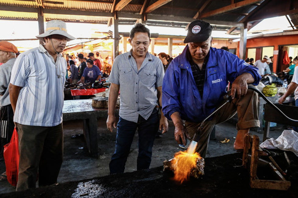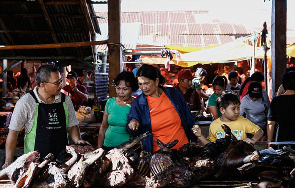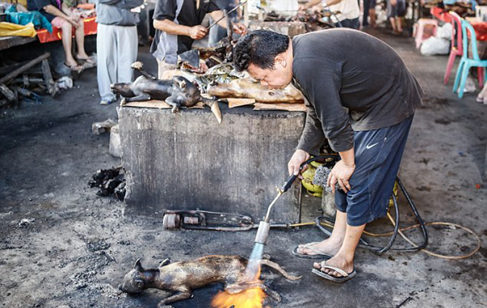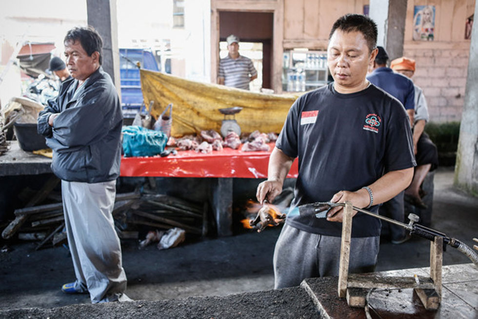 探秘印尼传统市场:一名男子正在用火枪烤狗。