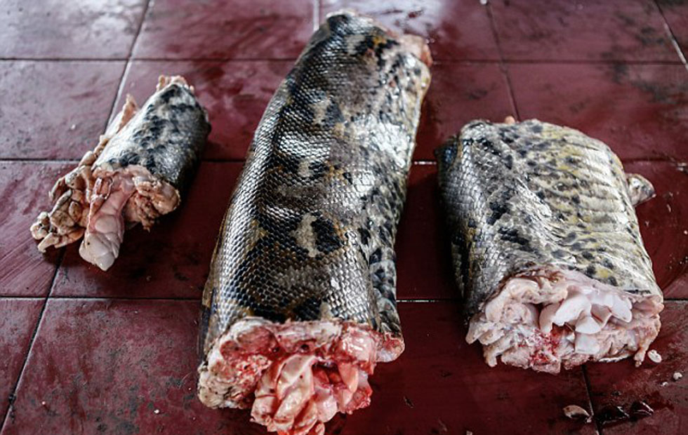 探秘印尼传统市场:现场火烤老鼠蛇等动物售卖,图为巨蟒肉。