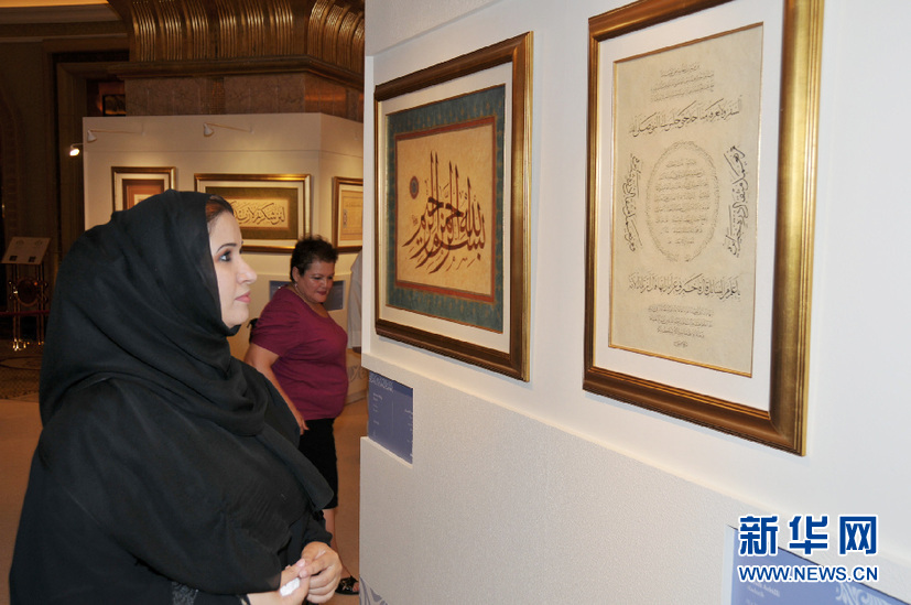 在阿布扎比举行的阿拉伯书法展上,一位阿联酋妇女在欣赏书法作品。新华社记者马锡平 摄