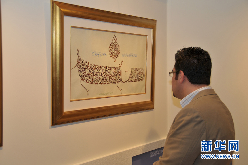 在阿布扎比举行的阿拉伯书法展上,一位观众在欣赏获奖书法作品。新华社记者马锡平 摄