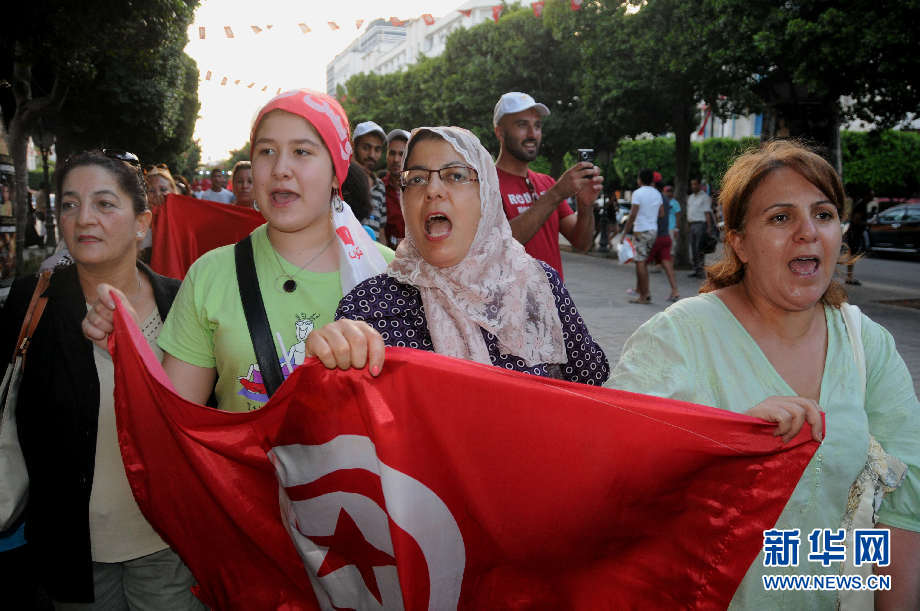 8月13日,突尼斯市布尔吉巴大街上,数十名突尼斯女性挥舞国旗,高喊口号反对以女性为目标的暴力行为,以纪念一年一度的全国妇女节。阿代尔 摄
