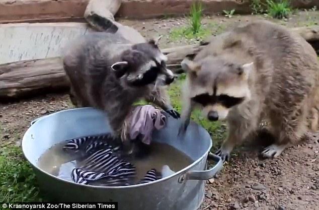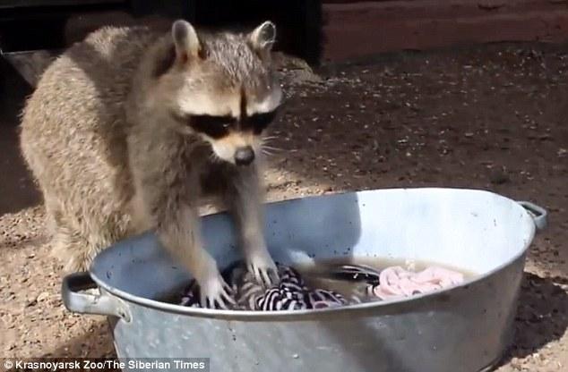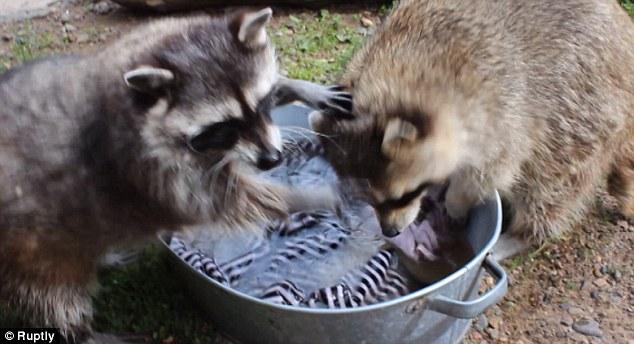 公浣熊洗衣不靠谱 母浣熊看不下去一把抢过