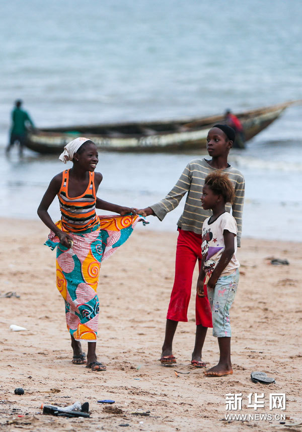 8月14日,三名女孩在塞拉利昂首都弗里敦隆吉国际机场通往市区快艇码头旁的沙滩上玩耍。