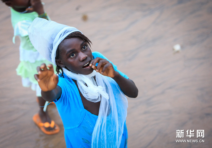 8月14日,一名女孩在塞拉利昂首都弗里敦隆吉国际机场通往市区快艇码头旁的沙滩上挥手。