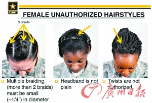 今年三月中旬,官方规定出台前,美军一个幻灯片演示列举了不允许的发型。其中,如果超过2条辫子,则每条辫子的直径必须小于6毫米;不允许扎头饰带;禁止细辫子等。(瀚辰)