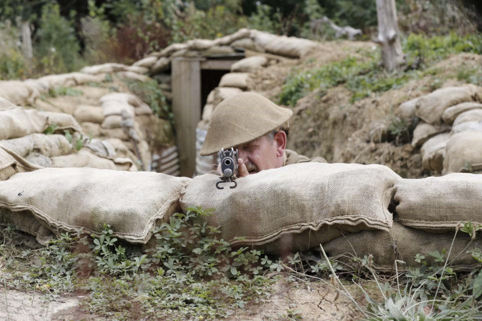 罗伯肖邀请一些历史协会和历史学校来体验战壕中的真实生活,从生活条件和武器装备都完全依照一战时期。图中罗伯肖在用枪瞄准。