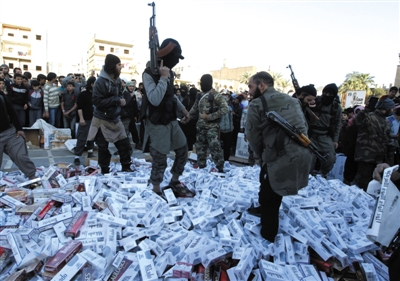 4月2日,“伊斯兰国首都”叙利亚拉卡,武装人员焚烧没收的香烟。