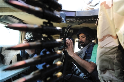 16日,载着媒体记者的伊拉克库尔德武装军车正在巡逻。目前西方正全力援助库尔德武装。