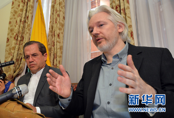 8月18日,在英国伦敦,“维基解密”创始人阿桑奇(右)和厄瓜多尔外交部长里卡多·帕蒂诺出席在厄瓜多尔驻英国大使馆举行的新闻发布会。厄瓜多尔驻英国大使馆当日在伦敦召开新闻发布会,宣布厄瓜多尔将与英国谈判,寻求以外交方式“友好”解决“维基揭秘”网站创始人阿桑奇在该使馆避难造成的僵局,阿桑奇本人有望结束已持续两年的政治避难重获自由。新华社发(约翰·史迪威摄)