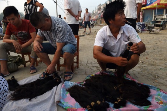 太和县的小商贩们正在街头市场上摆摊售卖头发。该县2012年头发产业的出口额为5200万英镑——几乎占据了该县总出口额的一半。