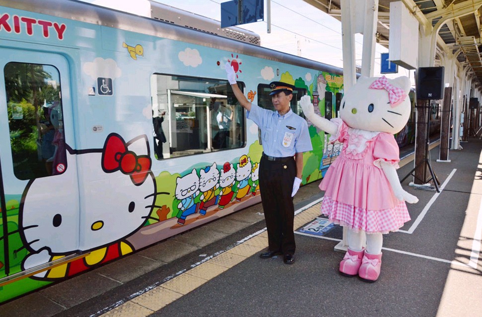 国际在线专稿:据日本《产经新闻》8月18日报道,西日本铁路公司(JR西日本)18日举行了“凯蒂猫”(Hello Kitty)号专列的试乘会。该列车的车身和内部处处印满凯蒂猫形象。