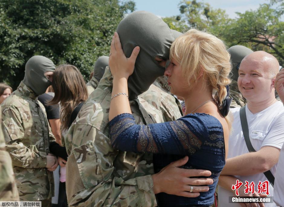 当地时间2014年8月17日,乌克兰基辅,志愿者将启程前往东部加入“亚述”特战营,与亲俄武装交战,图为一对情侣接吻告别。乌克兰国家安全议会称,政府军在经过激烈的战斗后已拿下位于卢甘斯克的一座警局,乌克兰政府当天同时也报告称一家乌克兰战斗机遭亲俄武装击落。