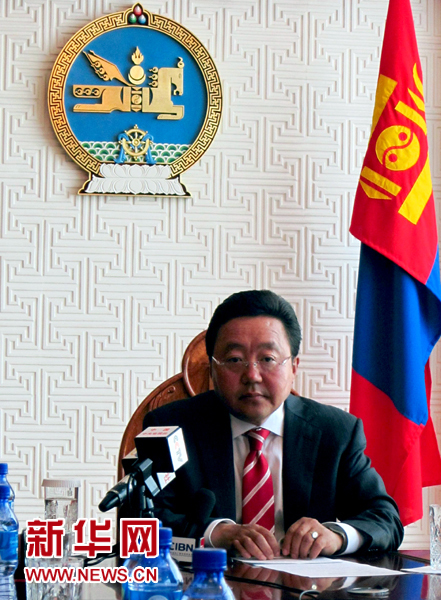 8月15日,蒙古国总统额勒贝格道尔吉在乌兰巴托接受中国新闻代表团的联合采访。新华社记者冯坚摄