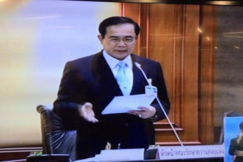 据报道,巴育在当天的会议上讲话时穿着西服出场,西服为深蓝色且系上了天蓝色的领带。巴育讲话时强调,希望立法议会能优先通过2015年度财政预算有关议案。