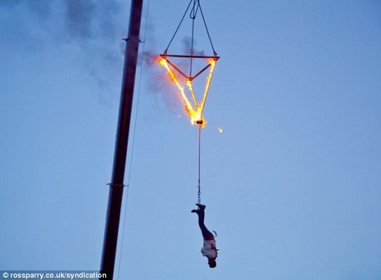 身穿约束衣的布里顿,将自己倒吊在离地30英尺(约9米)的高空,点火燃烧绑在脚上的3条绳索,表演空中脱逃。