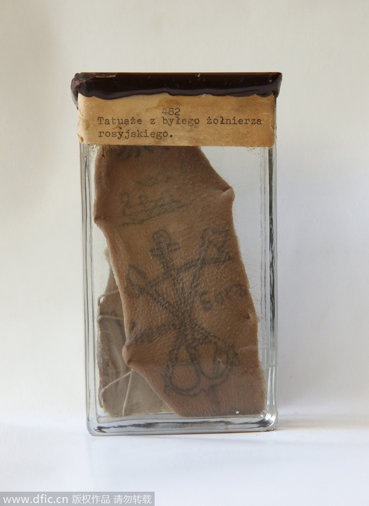 波兰克拉科夫,当地雅盖隆大学的医学系法医专业最近展出了一系列时间大约在十九世纪与二十世纪之交的纹身。时至今日,这些纹身依然作为犯罪学专业学生们的教学工具。这38块十分有趣的人类皮肤被病理学家在尸检的过程中保留了下来。它们被保存在装满福尔马林的玻璃罐中。一百多年前,当时克拉科夫还属于奥匈帝国,那时纹身还很少见,只有在罪犯身上能见到。这也解释了为什么那时候的纹身大多都是低俗的性爱场景。甚至还有人在自己的阴茎上纹了一朵玫瑰,后被证明他患有性病。在这些纹身中还有宗教图案以及拿破仑-波拿巴和弗朗西斯-约瑟夫大公的肖像。雅盖隆大学还保存有一些列刀伤和枪伤的皮肤样本,以及一些非法堕胎后的人类胚胎和胎儿标本。