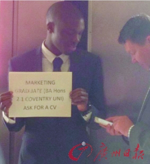 阿贾尼穿着西装,站在人来人往的滑铁卢地铁站入口处,举着一块白色标牌,上面写着“考文垂大学市场营销专业,成绩优秀,请求面试机会”。