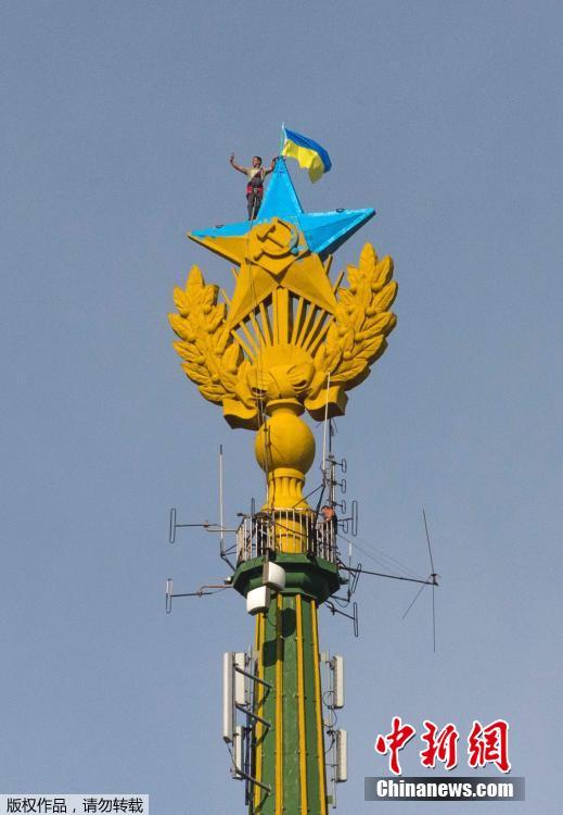当地时间2014年8月20日,俄罗斯莫斯科,不明身份的男子爬上斯大林式著名建筑“七姐妹”摩天大楼的尖塔,把黄色五角星的一半涂成了蓝色,还插上了一面乌克兰国旗。