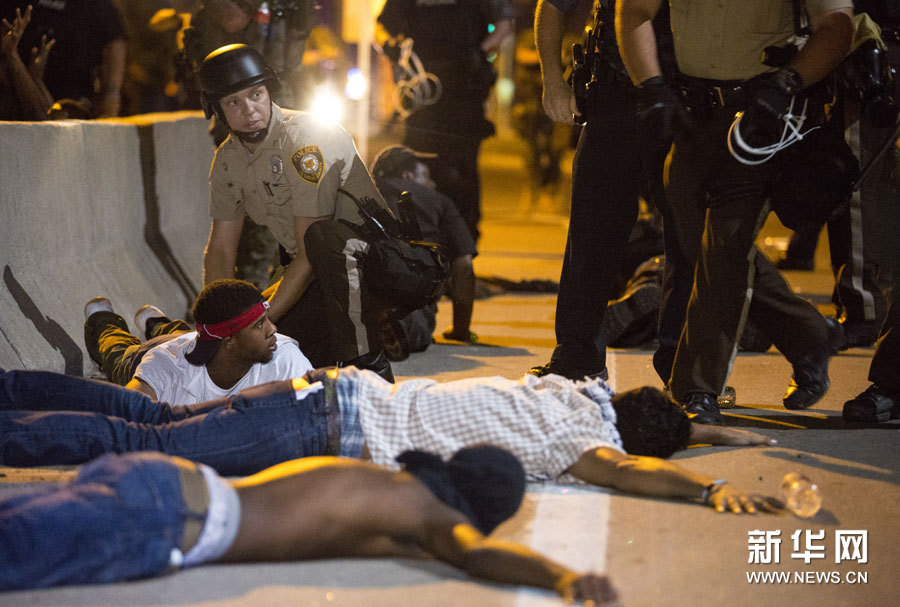 8月19日,警察在美国密苏里州弗格森逮捕抗议者。当日,继18岁黑人青年迈克尔·布朗9日下午被警方射杀后,密苏里州圣路易斯市北部一非洲裔男子19日中午因涉嫌持刀袭警,被警察击毙,导致弗格森街头抗议升级。新华社发(沈霆摄)