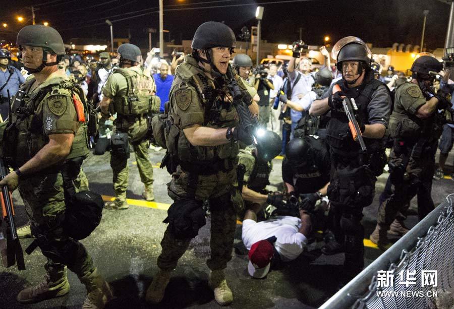 8月19日,警察在美国密苏里州弗格森逮捕抗议者。当日,继18岁黑人青年迈克尔·布朗9日下午被警方射杀后,密苏里州圣路易斯市北部一非洲裔男子19日中午因涉嫌持刀袭警,被警察击毙,导致弗格森街头抗议升级。新华社发(沈霆摄)